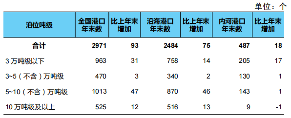 年末全国港口万吨级及以上泊位2971个,比上年末增加93个。从分布结构看,内河港口万吨级及以上泊位487个、增加18个,沿海港口万吨级及以上泊位2484个、增加75个。从用途结构看,专业化万吨级及以上泊位1579个、增加35个,通用散货万吨级及以上泊位698个、增加34个,通用件杂货万吨级及以上泊位463个、增加16个,客货万吨级及以上泊位3个、与去年持平,多用途万吨级及以上泊位193个、增加10个。