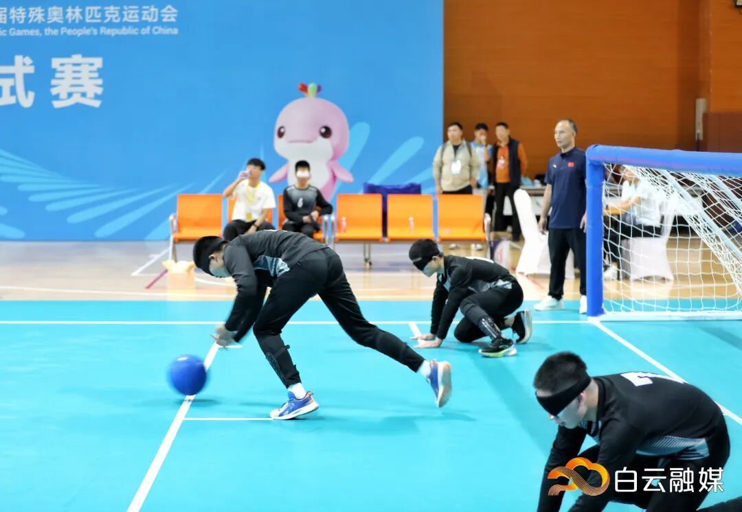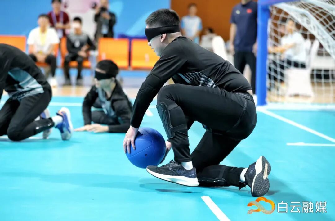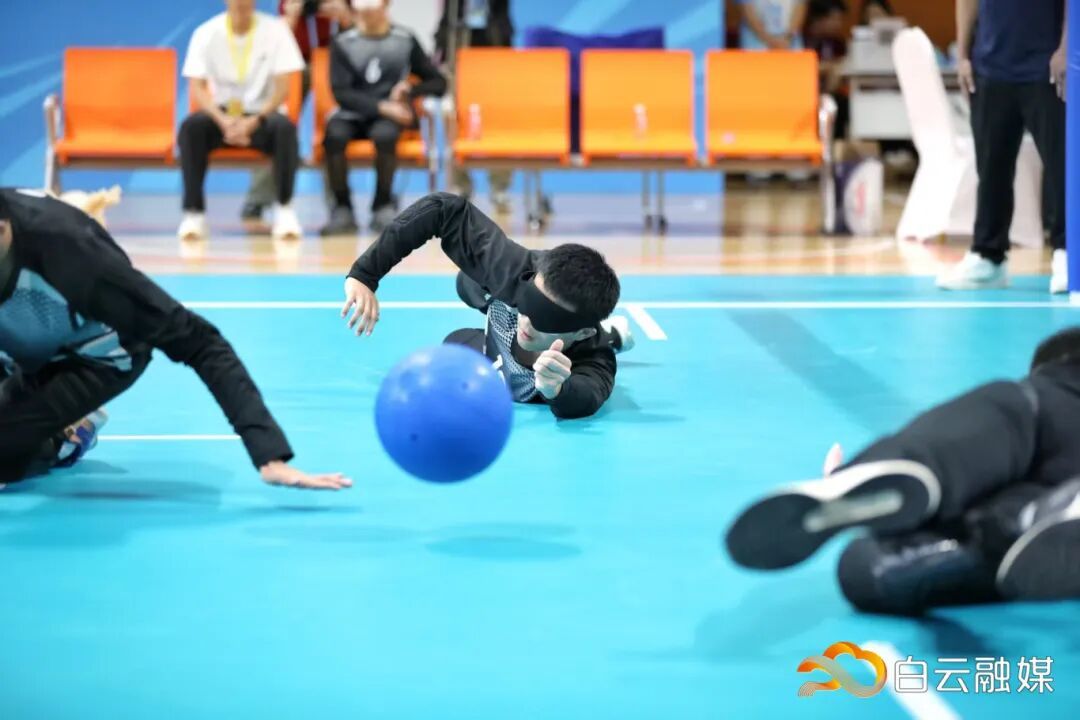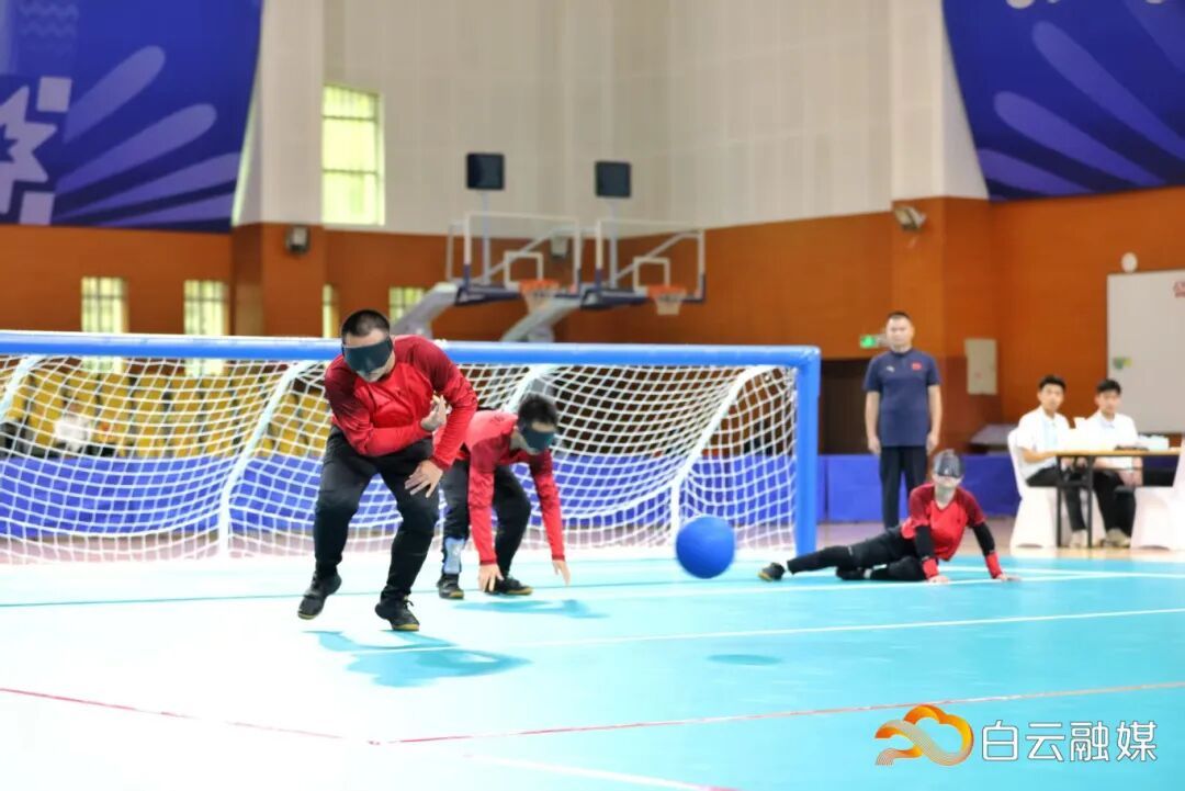 比赛中,双方进攻队员奋力掷球,球体带着急促的铃声射向球门;防守队员则如猎豹般闻声而动,飞身扑救,用整个身体封堵9米宽的球门线。期间,广东盲人门球一队进攻果断,多次打出角度刁钻的球,防守端也反应迅速,屡次飞身封堵对方射门。上半场结束时,比分已大幅领先,比赛提前失去悬念。